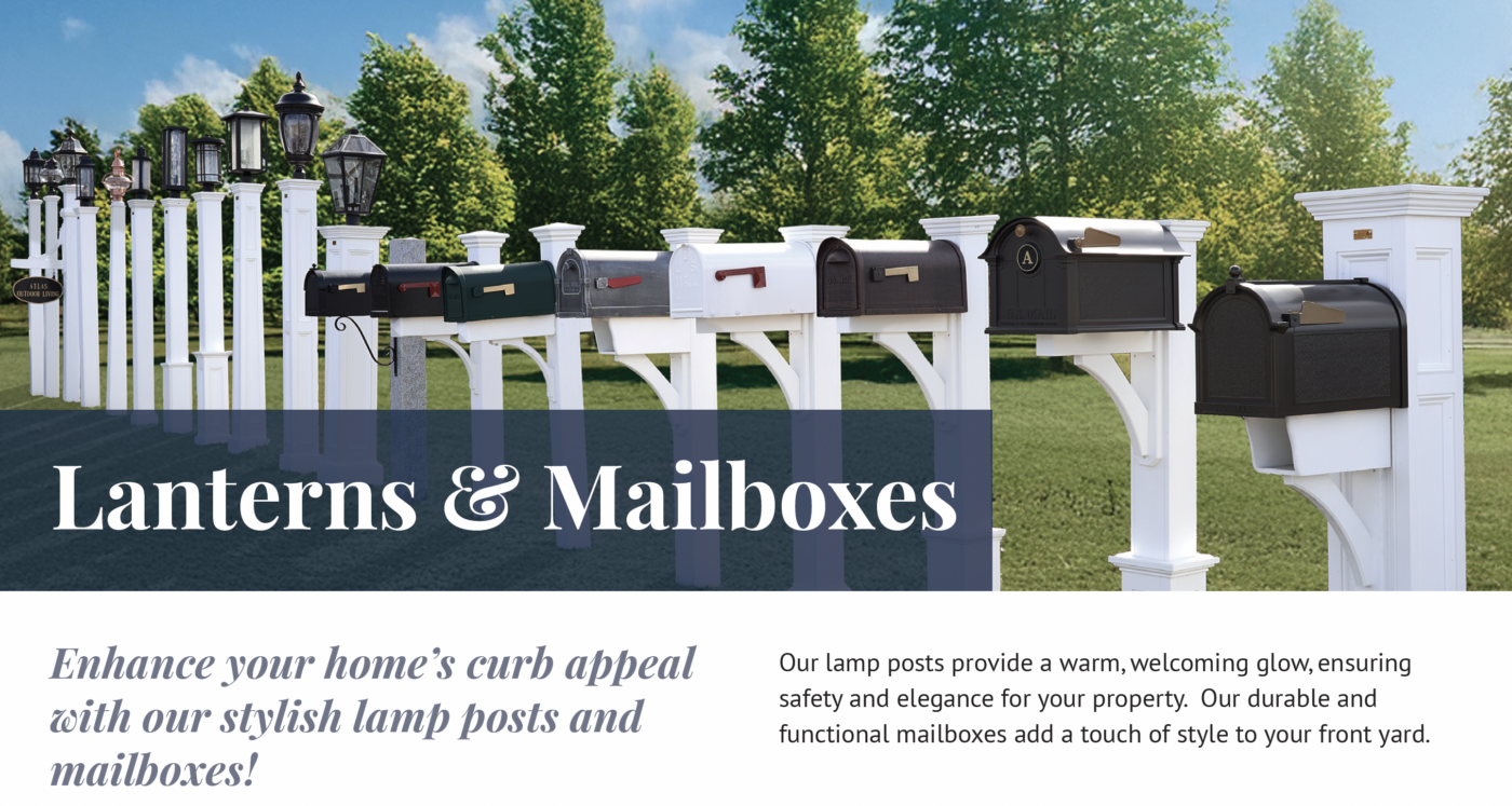 Built to stand strong and sturdy through the seasons, outdoor mailboxes and lantern posts are hand crafted with great attention to detail using only top quality materials. Greet your guests with a warm and aesthetic welcome.