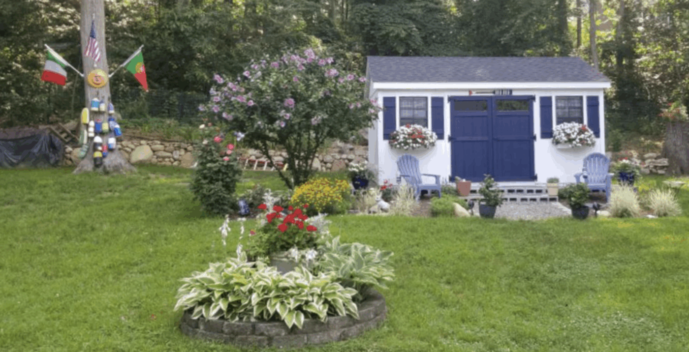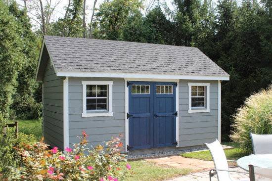 12’x14′ Garden House (321) in LP Lapp Siding and MiraTec trim in BM Hale Navy, Weatheredwood 30-year architectural shingles, Double Carriage House Door. 2 – 30″x36″ Inset Vertical Slider Windows with Screens and Shutters. Gable Vents.