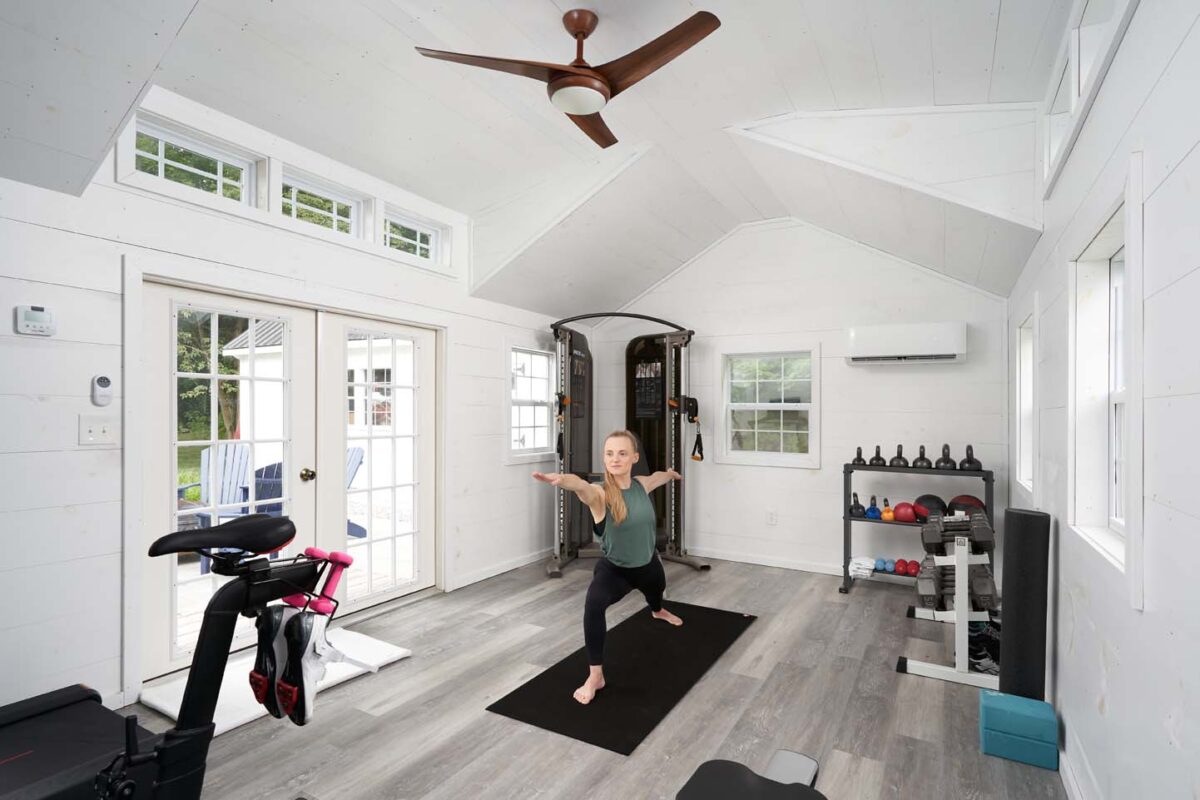 10’x12′ Cape (307) Charcoal SmartSide Cedar Impression Siding with Tyvec Wrap and MiraTec trim in White, Pewter Gray 30-year architectural shingles. Pre-Hung 15-lite Door, 3 – 30″x36″ Insulated Vertical Slider Windows, Spray Foam Insulation with a 1×6 Pine Tongue and Groove Hardwood Floor. Painted interior, Rough in Electrical Package, Soffit Vent and Rolled Ridge Vent. 21″ Cupola and Sailboat Weathervane.
