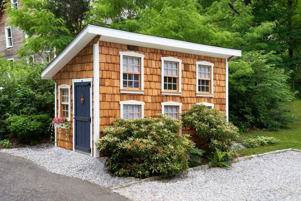 6’x8′ Garden House (282) – Clear Coat Cedar Shake Siding and White MiraTec trim, 30-year Weatherwood Architectural Shingles. 3′ Single Wood Door with Transom in White and 1 – 18″x36″ Inset Aluminum Slider Windows with Screens. White Flower Box. Gable Vents.