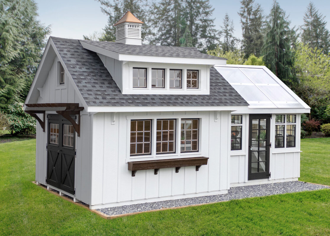 12’x14′ Garden House (250#2) in SmartSide Board and Batten and MiraTec Trim in White. 30-Year Architectural Shingles in Charcoal. Double Carriage House Doors (Black) with Pergola Overhang. 3 – 9-Lite Wood Windows and 8′ Transom Dormer. 14’x3′ Work Bench. 10’x12′ Atrium with Solar Fan and Planter Benches. ROUGH WIRED Electrical Package. 22″ Carlisle Cupola. Deluxe Window Box.